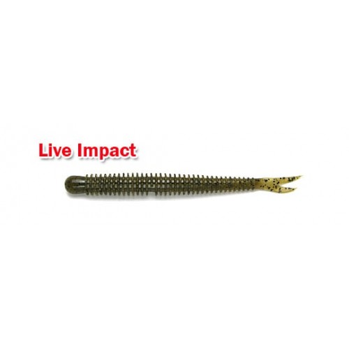 Quest'esca dritta e coperta di ring che ne aumentano le vibrazioni in acqua, ha una coda biforcuta. Il live impact è veramente versatile può essere utilizzato con diversi inneschi, quali, texas, jighead a wacky, wacky classico e neko rig. ideale per black bass soprettosi o per chi cerca il reale.