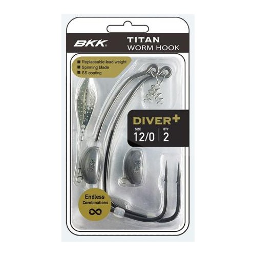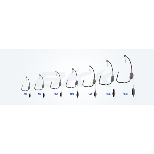 Amo offset con peso intercambiabile e paletta attrattiva. L'amo è il leggendario Titan Bkk. Perfetto per armare grosse gomme crecando lucci e siluri in ambienti infrascati o ad elevato rischio incaglio.