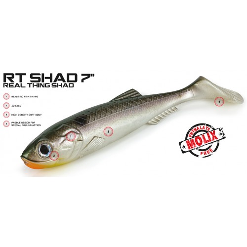 RT Shad 7” è una realistica soft shad realizzata attraverso una morbida miscela ad alta densità. Il particolare design imita le forme di un pesce foraggio che scatenerà l’istinto predatorio anche dei predatori più svogliati e diffidenti. Forma, profilo idrodinamico e il paddle voluminoso conferiscono un movimento di rollio